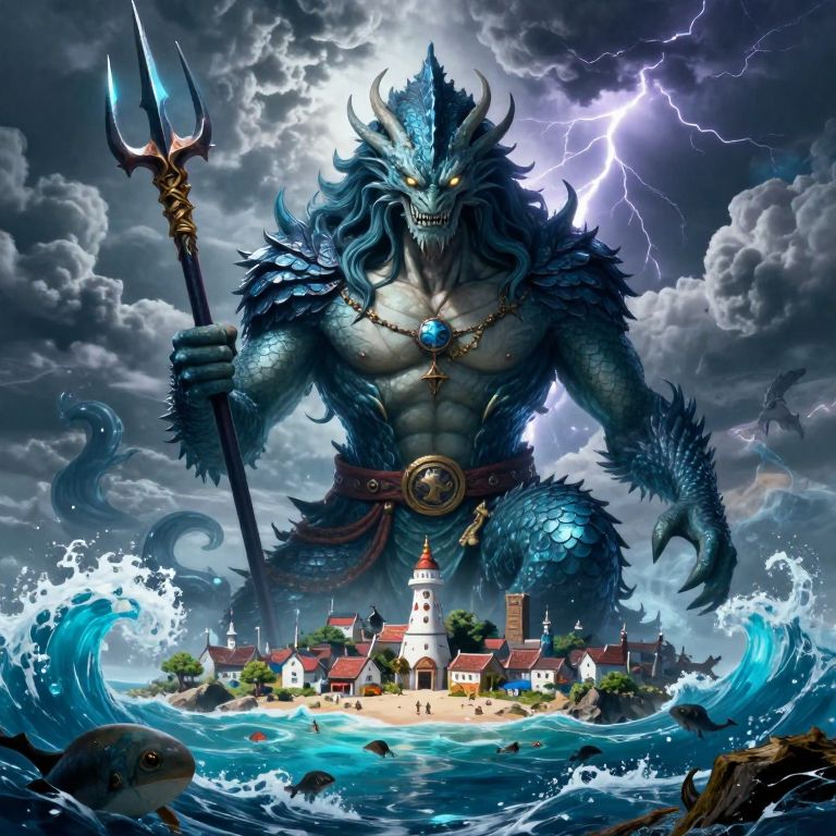 Arlong depicted as a mythical sea creature, towering over a coastal village, dramatic clouds and lightning enhancing his imposing presence, fierce eyes glowing, trident in hand, surrounded by swirling water and marine life, fantasy art style