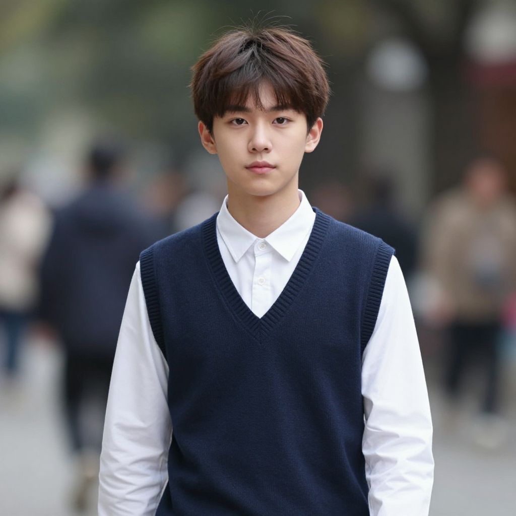 Photograph of a young Asian man standing in an urban outdoor setting with a blurred background of people and trees. He has straight, dark brown hair with bangs, and is wearing a white button-up shirt under a dark blue, sleeveless V-neck sweater. His expression is neutral, and he looks directly at the camera. The background is out of focus, emphasizing the subject. The lighting is natural, and the overall tone is slightly cool, with the colors being predominantly white, blue, and gray. The image has a shallow depth of field.