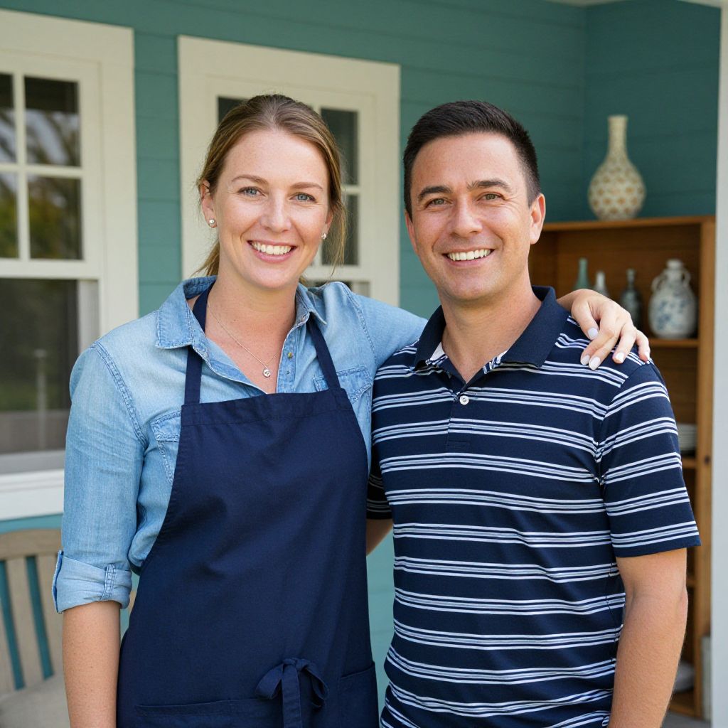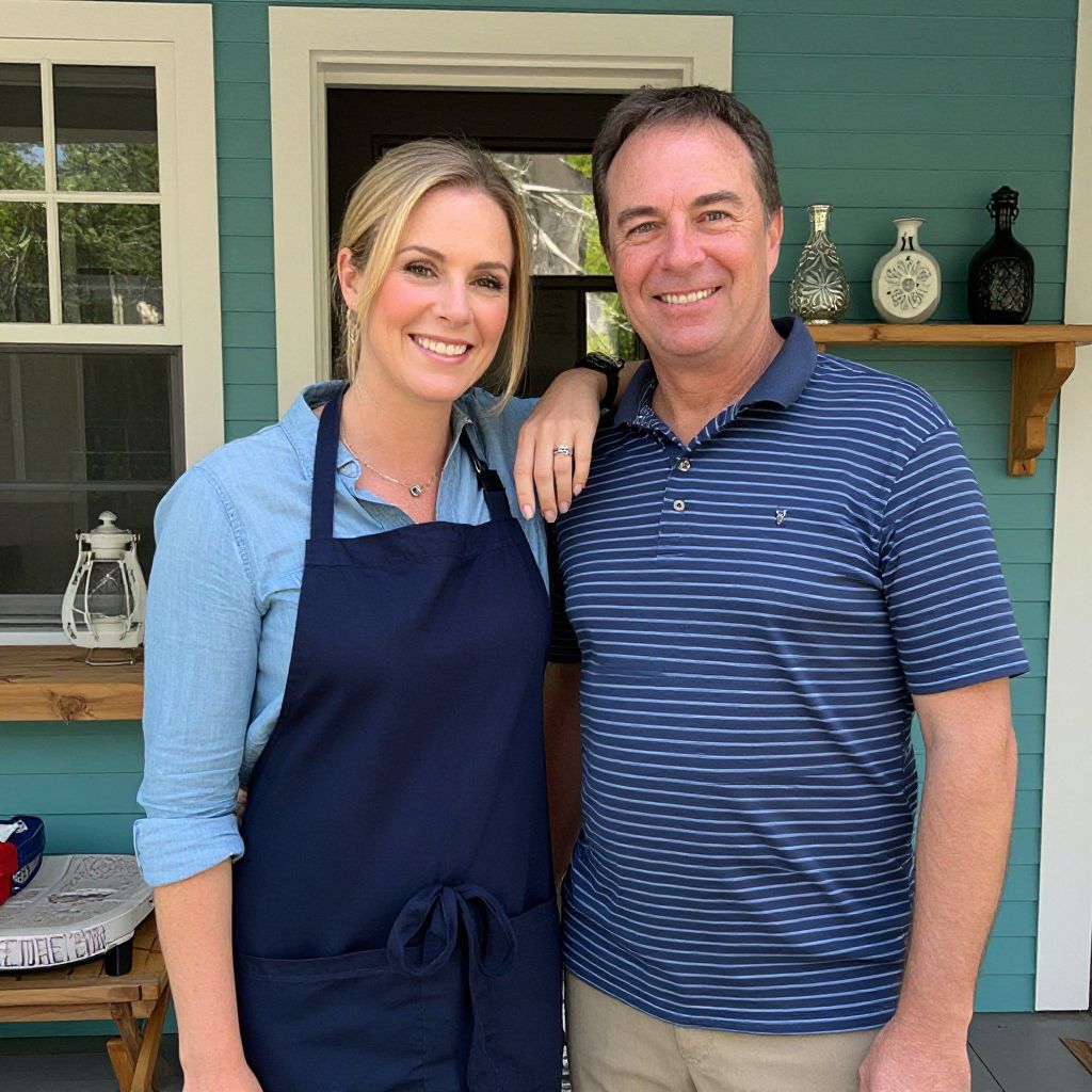 Two smiling individuals stand together outdoors, with the woman wearing a blue shirt and navy apron, her arm affectionately draped over the man's shoulder, who is dressed in a striped polo shirt, set against a backdrop of a teal house exterior featuring white-framed windows and decorative items on a wooden shelf.