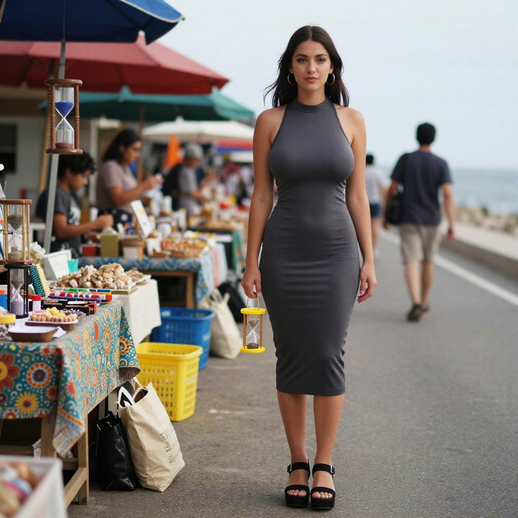A hourglass woman in a minimalist charcoal grey A-line dress with a high neckline and black platform sandals stands in a vibrant outdoor market by the seaside, surrounded by colorful stalls and lively activity. Visual style: oversaturated film. Sexy. Pretty face and beаutiful eyes. Big breasts