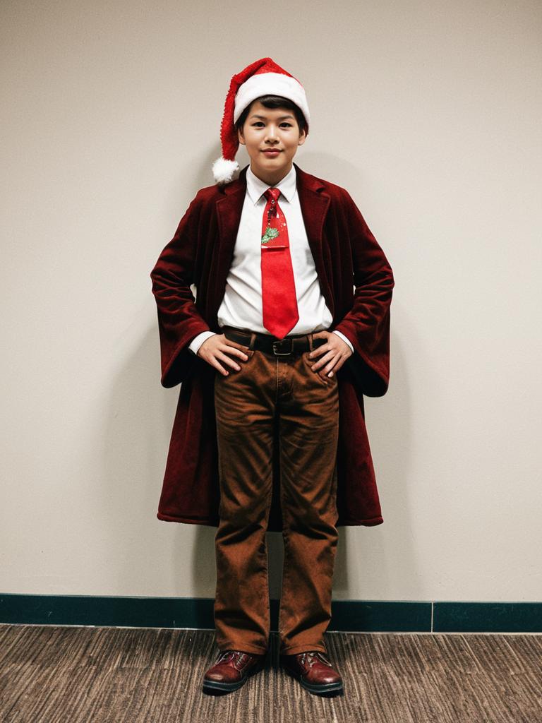 Christmas turkey costume, solo, male focus, 1boy, hat, brown pants, santa hat, christmas, full body, standing, looking at viewer, pants, shoes, hands on own stomach, necktie, coat, meme, poncho