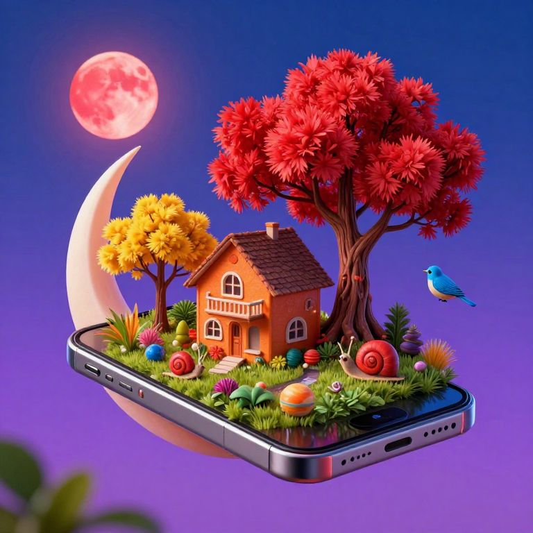 Colorful digital illustration of a miniature orange house with red trees, colorful flowers, and a blue bird on a floating smartphone, under a glowing red moon