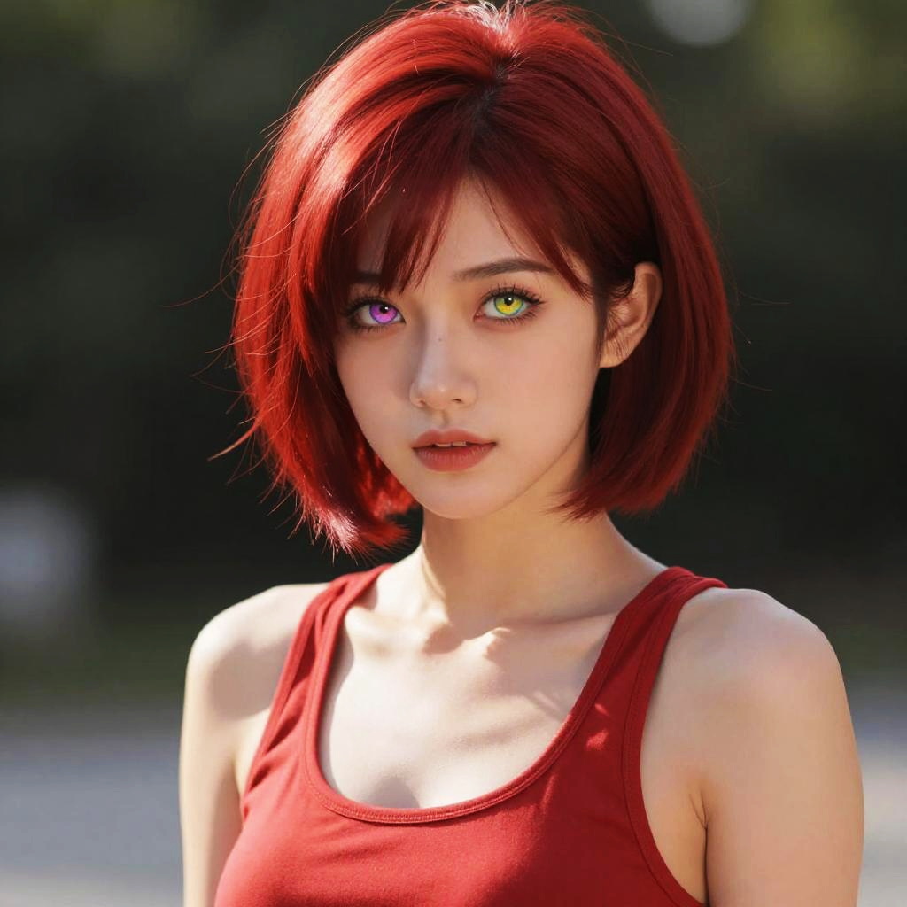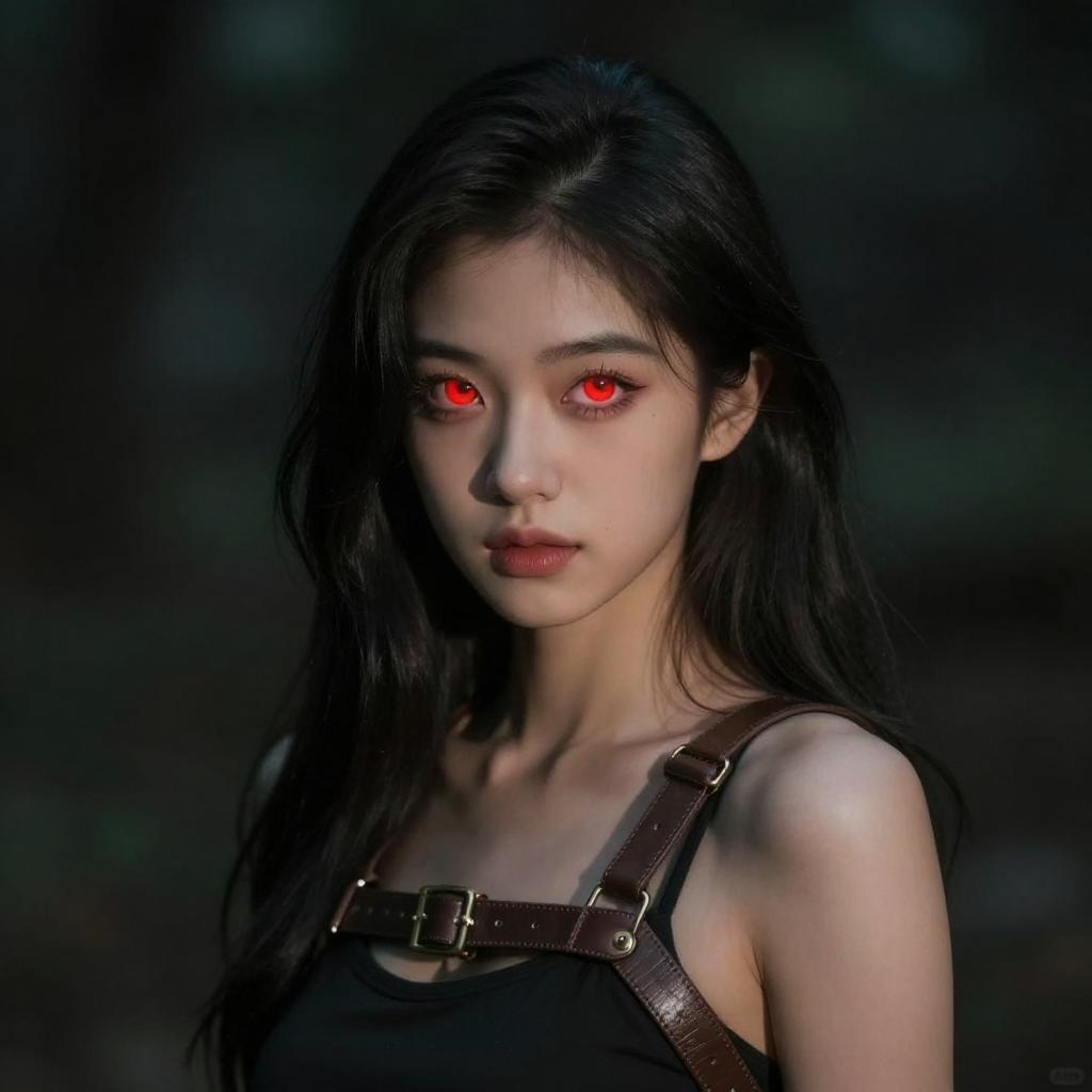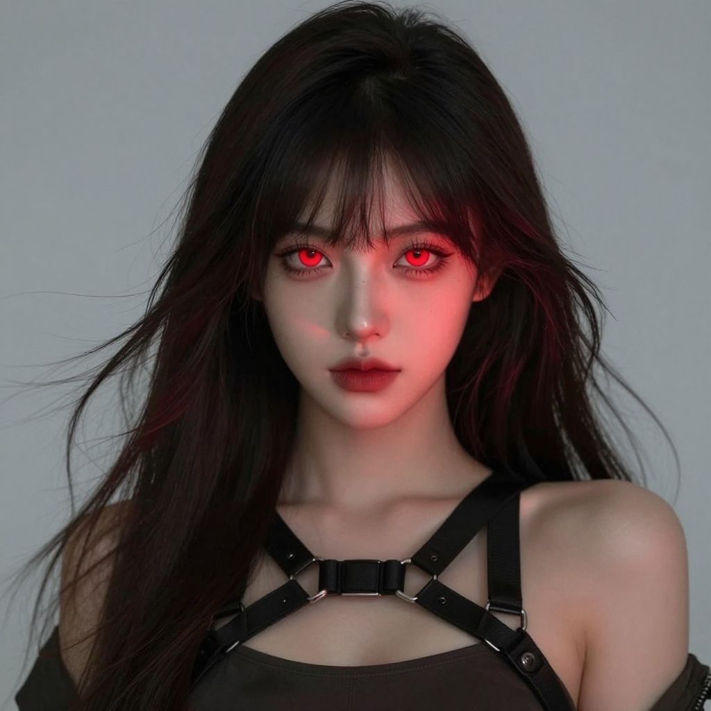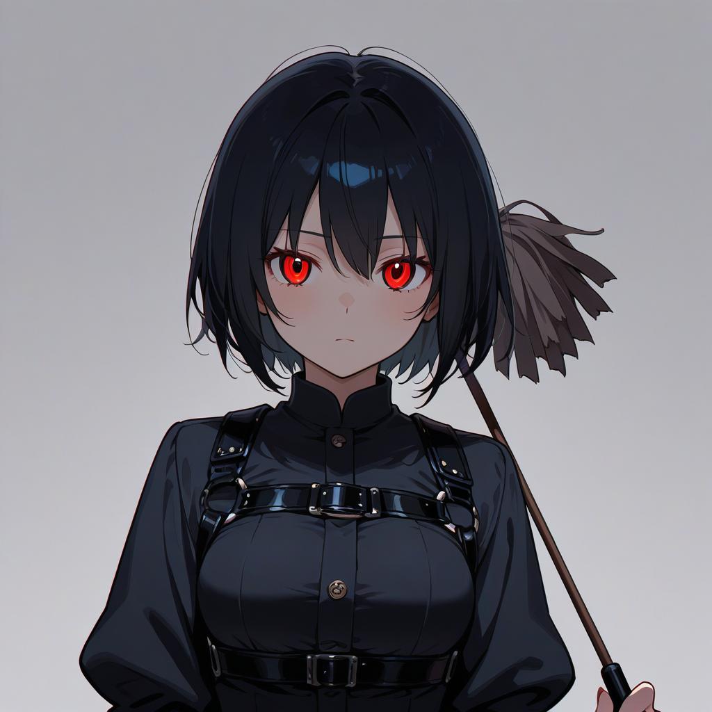 Masterpiece, best quality, 1girl, solo, glowing eyes, red eyes, duster, harness
