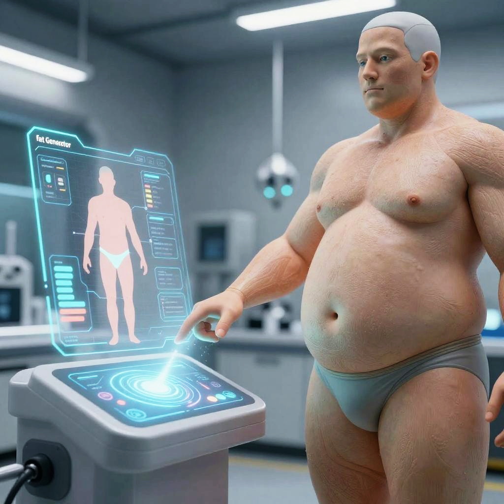 Close-up of AI fat generator technology interface, touch-responsive holographic controls manipulating human body fat levels, glowing futuristic GUI elements, detailed anatomical model exhibiting realistic fat tissue, sleek metallic laboratory background, sci-fi and cyber aesthetics