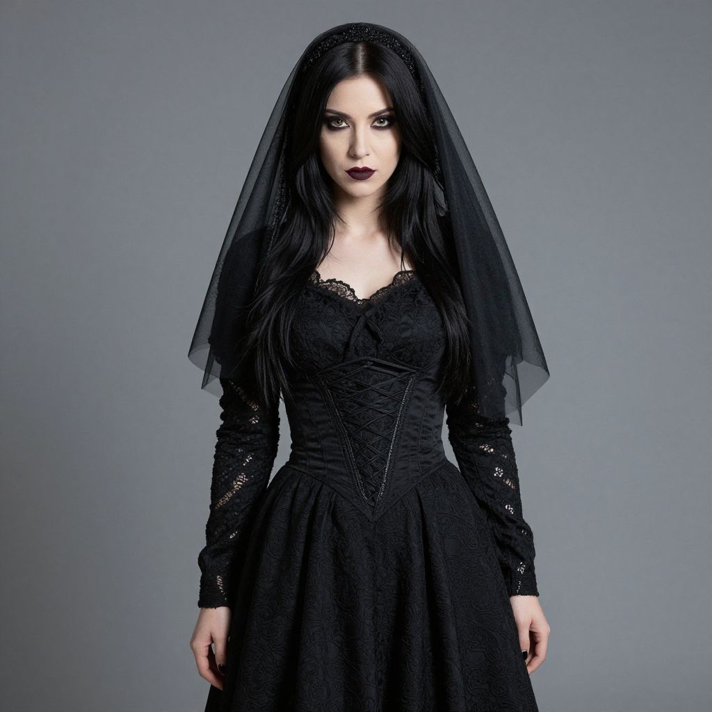Black Veil Bride Costume, woman wearing a black veil and a black dress