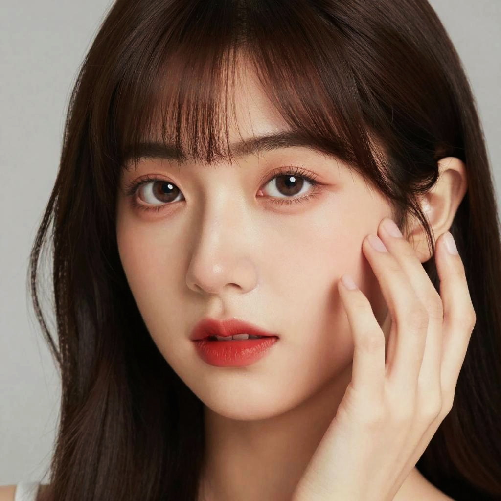 Photograph of an East Asian woman with fair skin, long straight black hair with bangs, and brown eyes. She is looking directly at the camera with a slight, neutral expression. Her lips are painted a glossy red. She is gently touching her right cheek with her left hand. The background is a soft, light gray, which makes her face the focal point. Her skin appears smooth and even, and her makeup is minimal, emphasizing a natural look. The lighting is soft, highlighting her facial features without harsh shadows.
