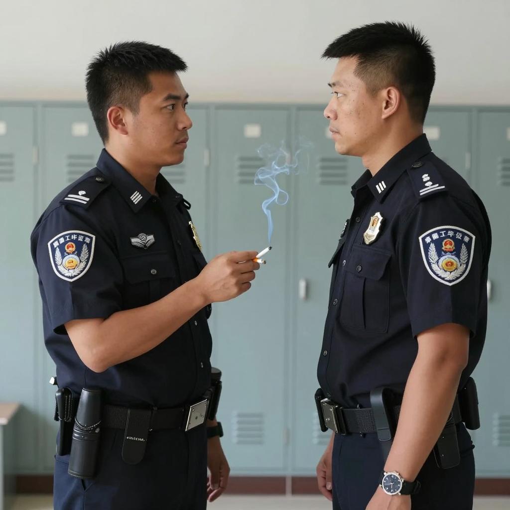 A man with short dark hair and a light green shirt lies face down on a checkered floor. Two uniformed men with hats stand in a doorway behind him. The room has white walls, a wooden door, and two wooden tables with papers and a box. The man on the floor has his arms raised. Two men stand in the doorway, one partially obscured.