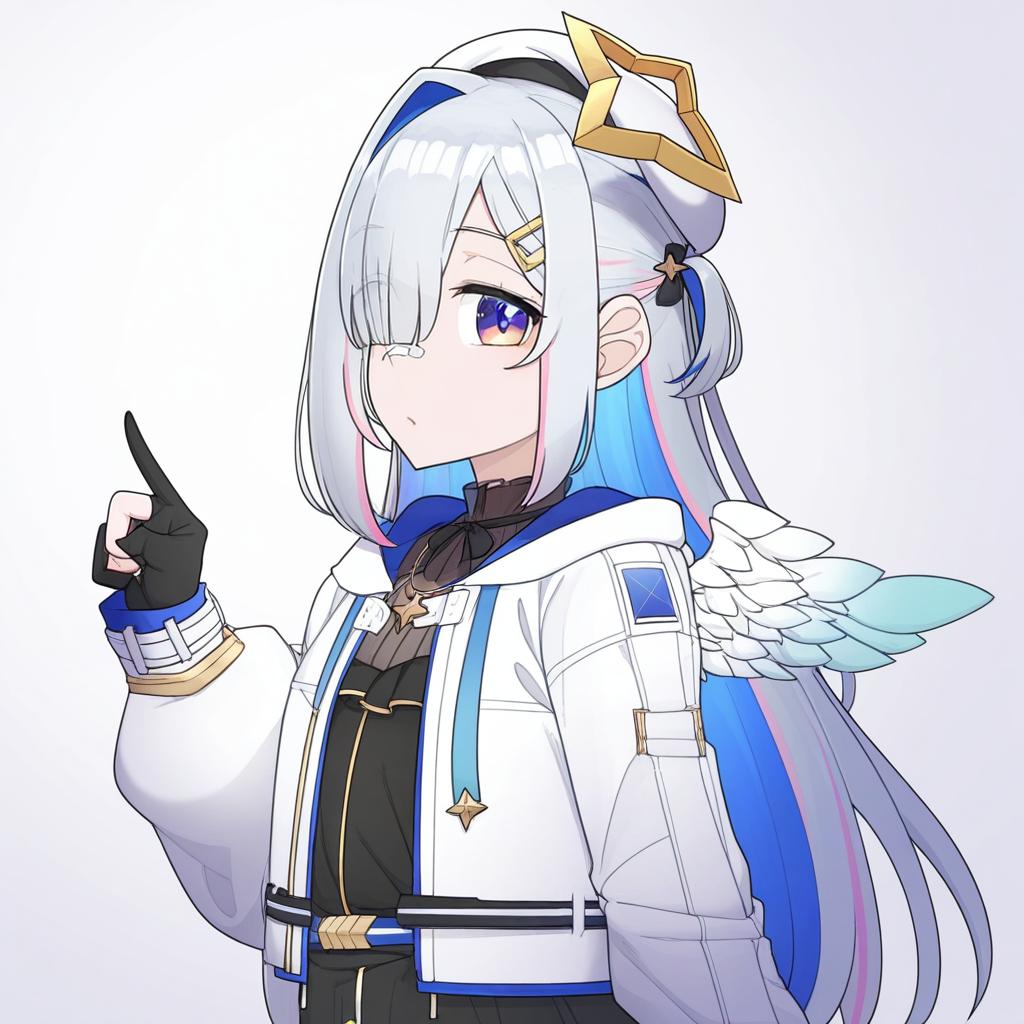 Amane kanata (work), hololive, 1girl, angel wings, angel, angel wings, purple eyes, hair over one eye, blue hair, grey hair, colored inner hair, single hair intake, official alternate hairstyle, long hair, official alternate hair length, streaked hair, pink hair, asymmetrical bangs, two side up, hairclip, black gloves, partially fingerless gloves, white jacket, black dress, white headwear, star halo, virtual youtuber, virtual youtuber, feathered wings, white wings, mini wings, feathered wings, white wings, mini wings, beret, by artist ekz (robotekz), leet