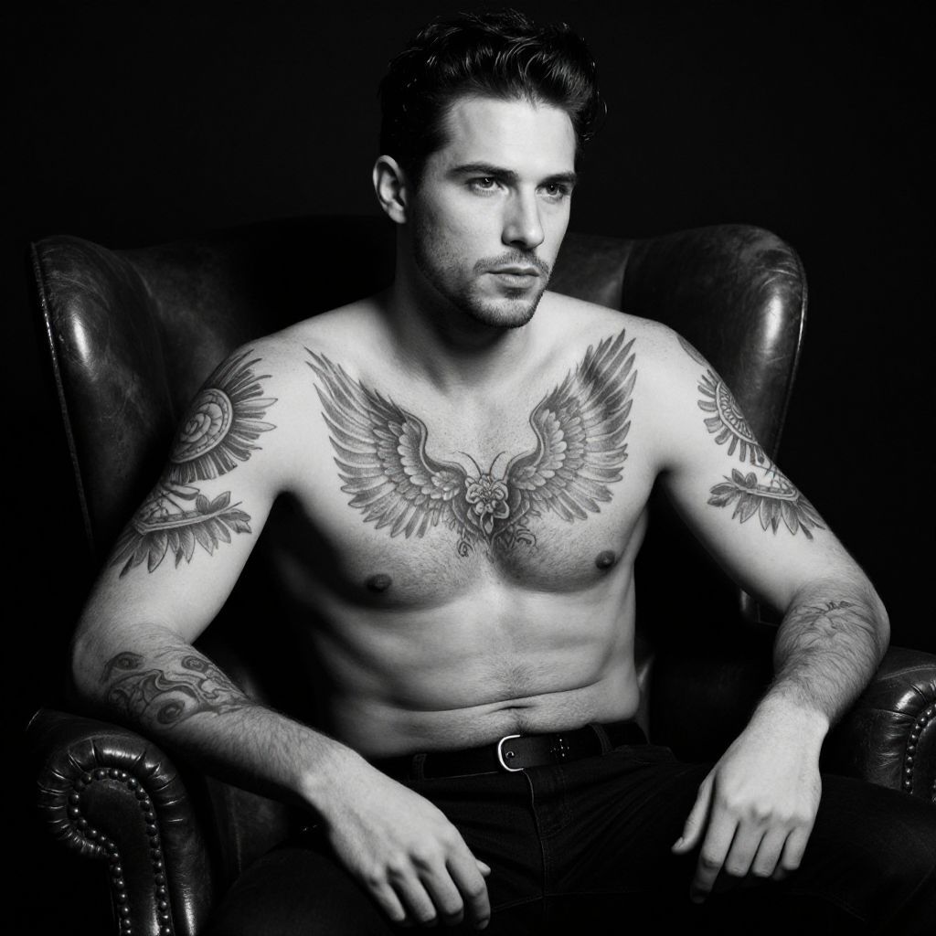 Tattooed model male sitting in a vintage leather chair, classic black-and-white photo style, detailed tattoos on shoulders and arms clearly visible, strong chiaroscuro lighting creating dramatic contrast, timeless artistic portrait capturing raw personality.