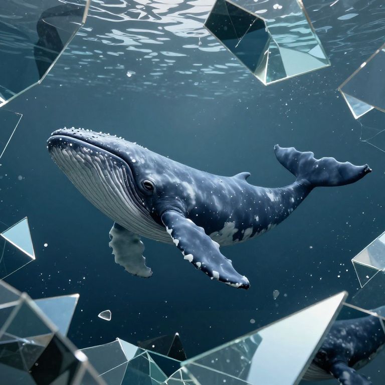 Digital art of a massive, detailed blue whale swimming underwater surrounded by geometric, reflective crystal shapes, creating a surreal, futuristic effect.