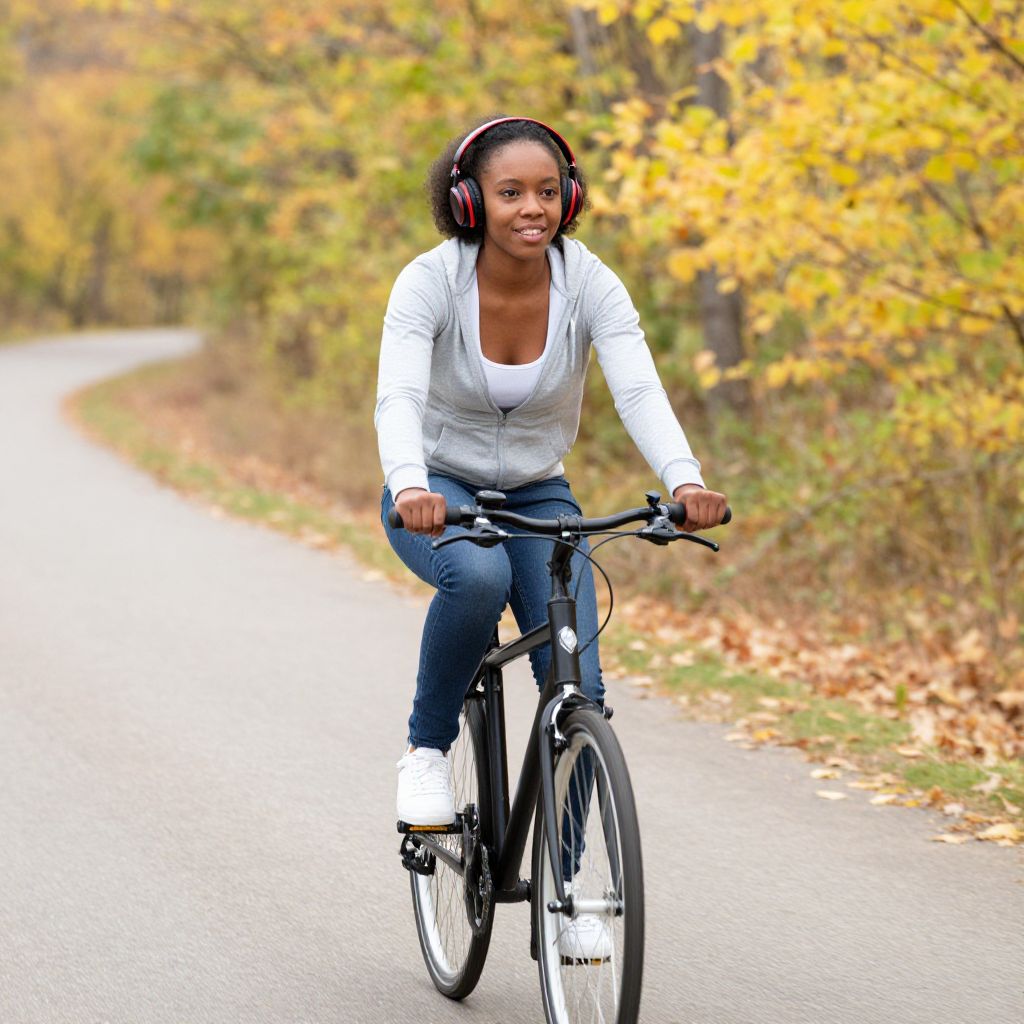 Young Black woman riding her bicycle along a paved trail, wearing black headphones with red accents and a smile, surrounded by vibrant autumn foliage and fallen leaves.