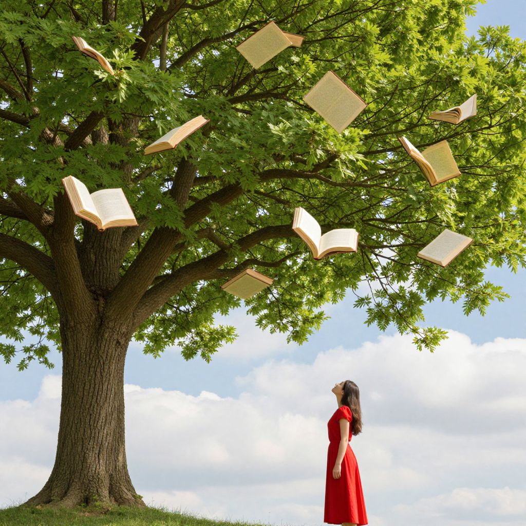 Books float gracefully among the branches of a vibrant tree, their open pages spiraling upwards against a backdrop of lush green foliage and a serene sky dotted with fluffy clouds, as a woman in a red dress stands below, gazing in wonder.