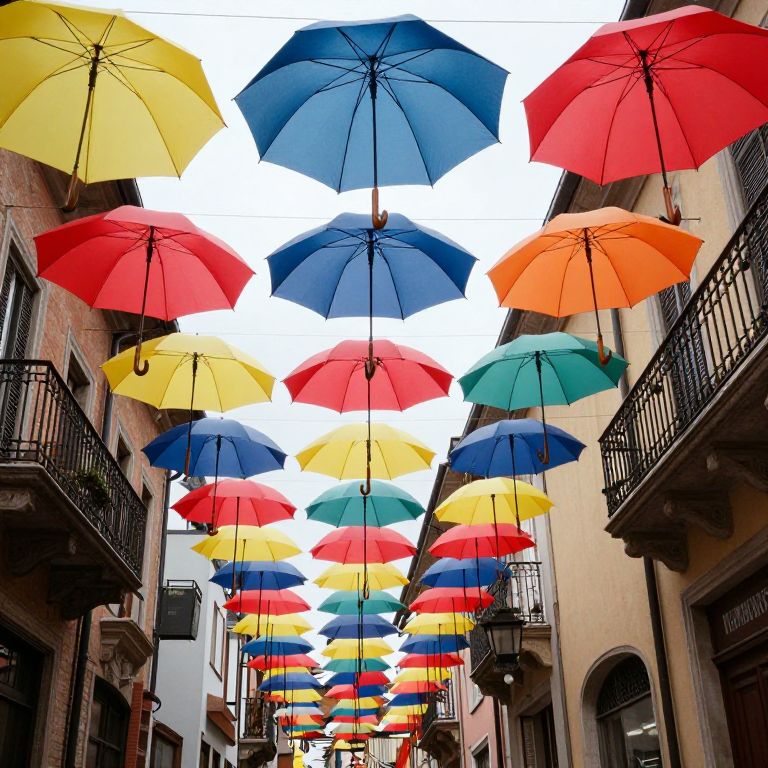 Suspended in mid-air like a whimsical canopy, a kaleidoscope of vibrant umbrellas defies gravity above a charming European street, transforming an ordinary walk into a magical journey.