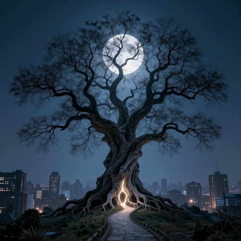 A colossal, ethereal tree stands sentinel over a sprawling cityscape, its gnarled trunk concealing a glowing pathway that winds into its heart, while its bare branches stretch toward a radiant moon, casting an otherworldly glow over the landscape below.