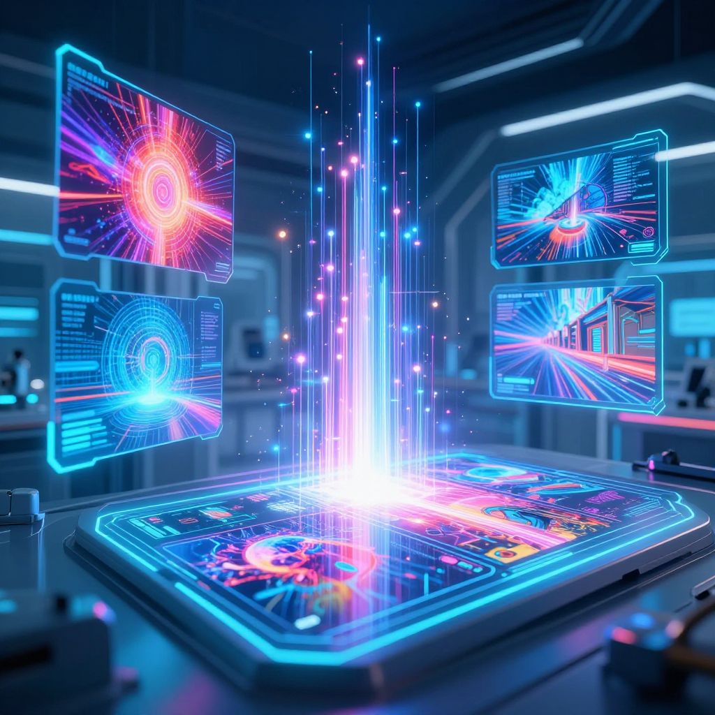 AI with pictures concept, a futuristic artificial intelligence interface analyzing and generating vivid digital images, glowing data streams, holographic screens, in a sleek high-tech lab environment, vibrant colors, ultra-detailed graphic design style
