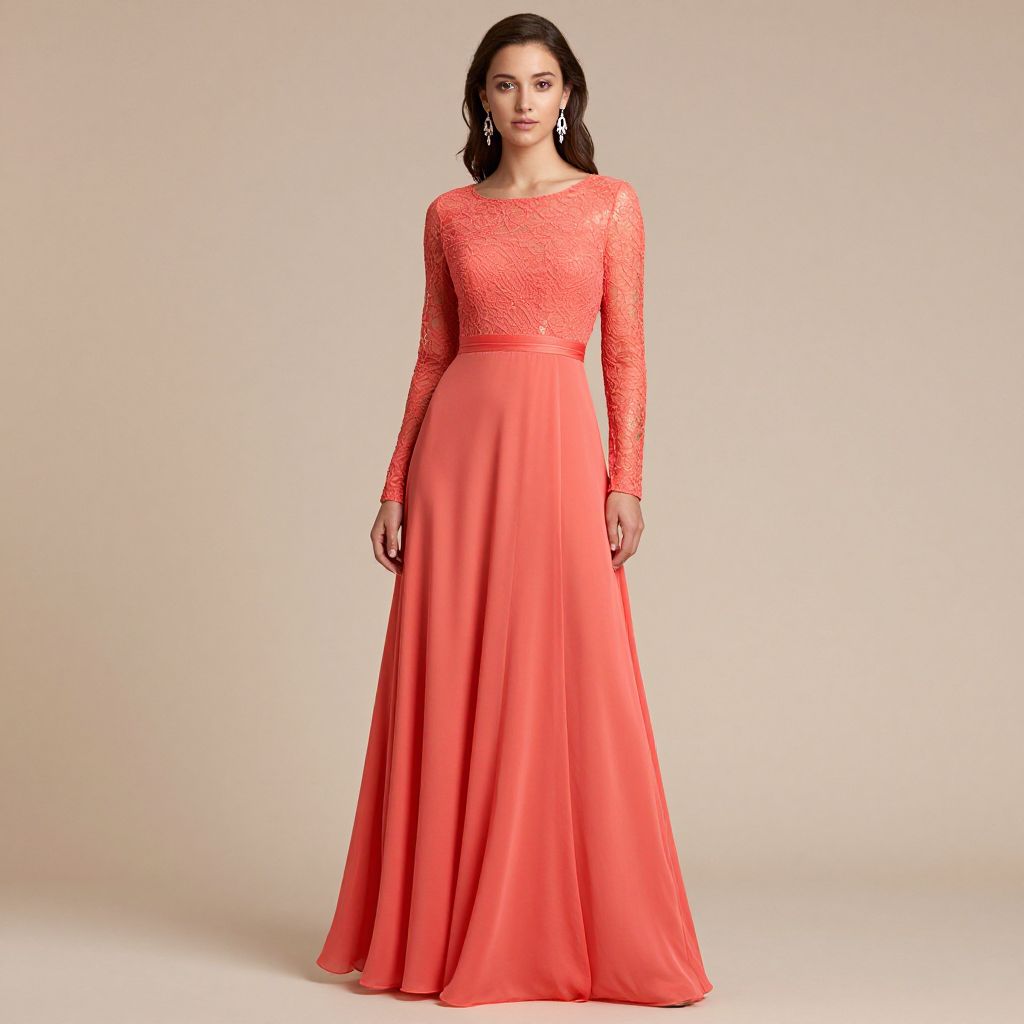 Photograph of a young woman standing against a plain, light beige background. She has dark, wavy hair and wears a full-length, floor-sweeping, coral pink gown with long sleeves and lace detailing on the bodice. The dress has a fitted waist and a flowing, smooth skirt. Her expression is neutral, and she gazes directly at the camera. She is wearing subtle makeup and small, dangling earrings. The lighting is even, highlighting the dress's vibrant color and delicate lace texture. The overall style is elegant and formal.