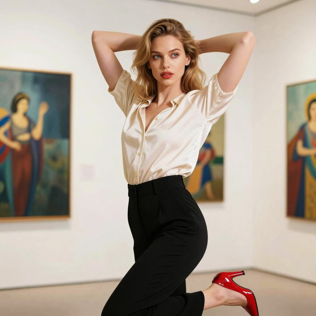 Photograph of a fair-skinned woman with wavy, shoulder-length auburn hair, standing in a cozy café. She wears a black-and-white striped sleeveless top, a high-waisted navy blue pencil skirt, and red flat shoes. Her arms are raised with hands behind her head, and she has bold red lipstick. The café has round yellow tables with patterned chairs, and the background shows a blurred window and greenery. Warm, soft lighting illuminates the scene, creating a relaxed, inviting atmosphere. The woman's confident, poised stance and classic, stylish outfit add a touch of elegance to the casual setting.