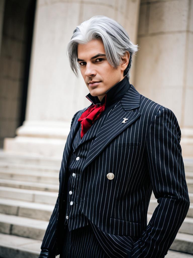 Photo-realistic cosplay photo of person in antonio salieri (second ascension) (fate) costume. 1boy, red eyes, hair between eyes, grey hair, white hair, short hair, pinstripe suit, suit, black gloves, pinstripe suit, suit, black jacket, long sleeves, formal, half updo, formal, red ascotlifestyle stock photo, shallow depth of field, lifestyle stock photography, shallow depth of field, natural lighting, warm tones, soft background blur, candid moments, vibrant colors, realistic textures, modern casual clothing. full body shot