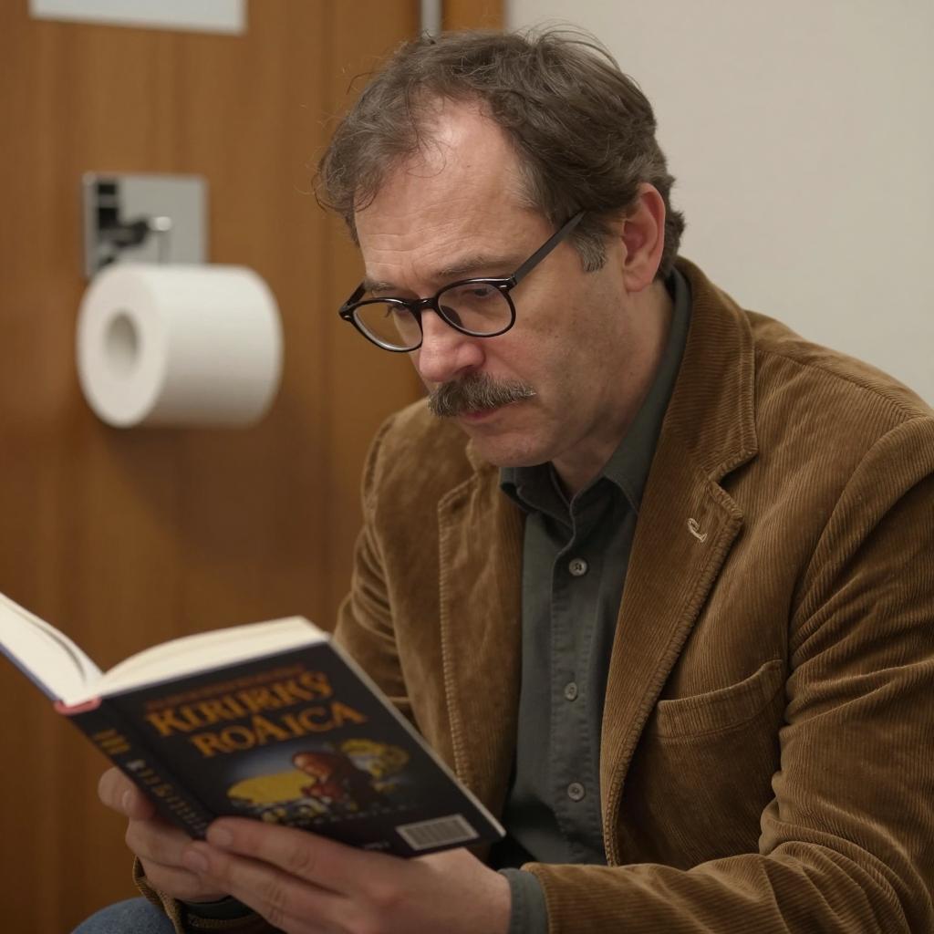 Middle-aged man with brown hair, glasses, and mustache, wearing a brown corduroy jacket, reading a book. Background includes a toilet paper roll on a wooden wall. He leans forward, focusing on the book, holding it with his right hand.
