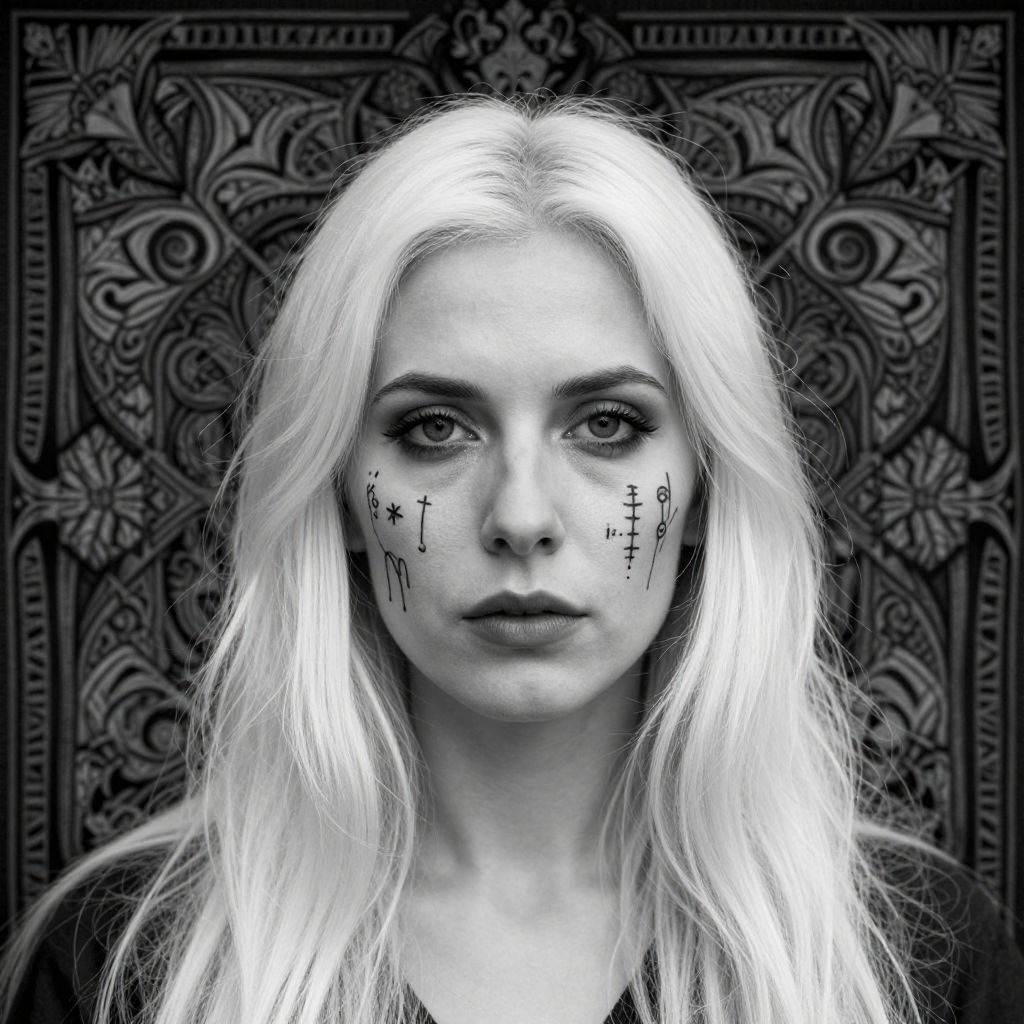 A black-and-white digital photograph of a young woman with long, white, slightly messy hair. She has pale skin and a serious expression, with dark, smoky eye makeup. Her face is adorned with black, Gothic-style tattoos or markings on her cheeks, including crosses, numbers, and dripping lines. The background features an intricate, dark, ornate pattern that contrasts with her light hair and face. She wears a dark top, and the high contrast emphasizes the dramatic, gothic aesthetic of the image. The overall style is edgy and moody.