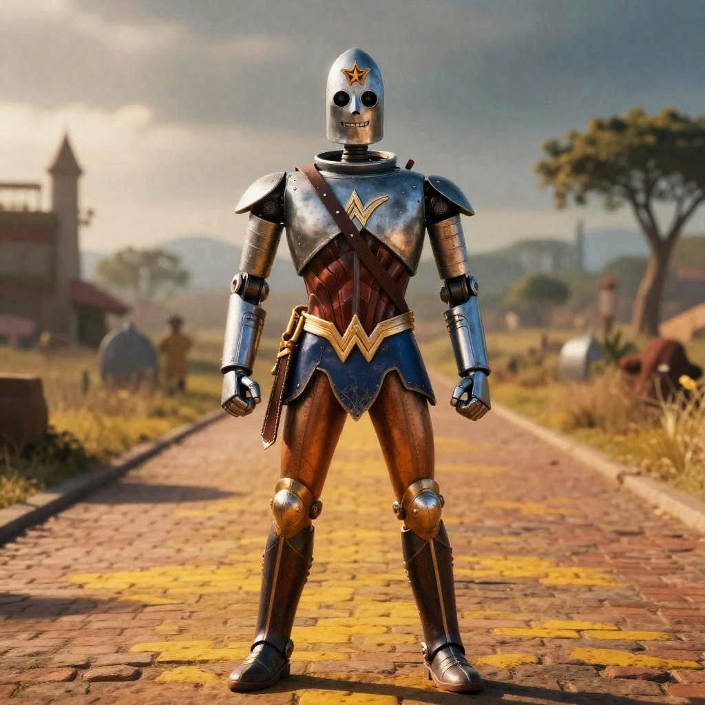 Realistic photo.Wonder Woman as the Tin Man from The Wizard of Oz, standing on the yellow brick road in the Land of Oz, dawn lighting, 8K resolution, hyper-realistic, dramatic, movie poster style, high definition, facing viewer realistic photo