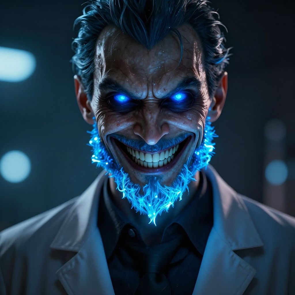 Digital art of a menacing man with glowing blue eyes, blue fire beard, and sinister grin, wearing a lab coat. Dark, eerie background with blurred