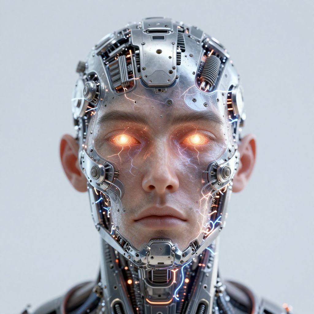 Reactor face model, concept art of a biomechanical entity with human facial structure overlaid with reactor elements, glowing fissures and energy flows beneath steel-like skin, high-tech futuristic atmosphere, ethereal lighting and sharp contrasts