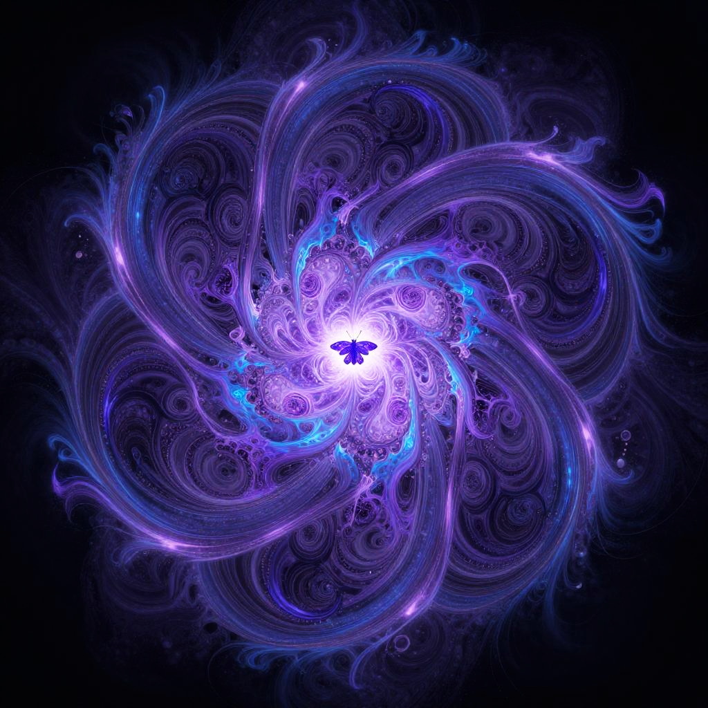 Digital art of a glowing, swirling vortex with purple and blue ethereal tendrils, centered on a bright white core, set against a dark black background