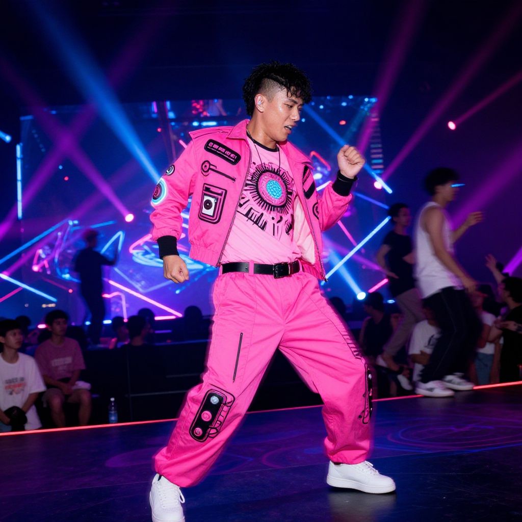 Energetic dance performer in pink guy costume on a neon-lit stage, surrounded by stunning light effects and dynamic crowds, motion blur capturing movement, the suit designed with bold patterns and futuristic accessories, vibrant synthwave aesthetic.