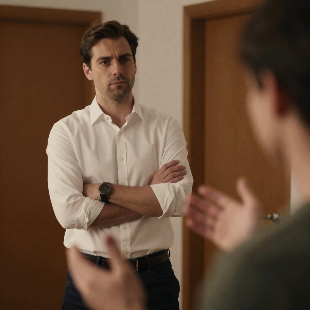 Photograph of a man with short brown hair, wearing a white button-up shirt and dark pants, standing with arms crossed, looking serious. Blurred figure in foreground on right gestures with hands. Background includes door and wall. Warm lighting.