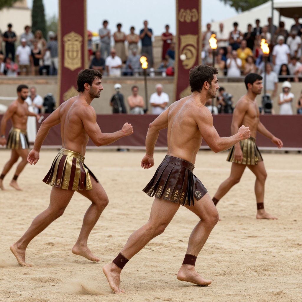 Naked Roman men athletes competing in ancient games, muscular and dynamic anatomy, sandy arena with cheering crowds in the background, Roman banners and torches, warm natural light highlighting sweat and muscle definition, historically accurate Roman athletic poses.