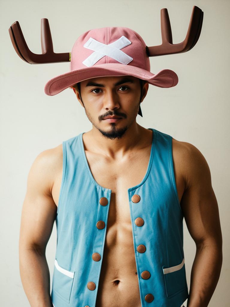 Portrait of a man cosplay dressed as Tony Tony Chopper from One Piece, wearing a distinctive pink hat with large antlers and a blue buttoned vest. The man has a serious expression and a muscular build, standing against a plain background.