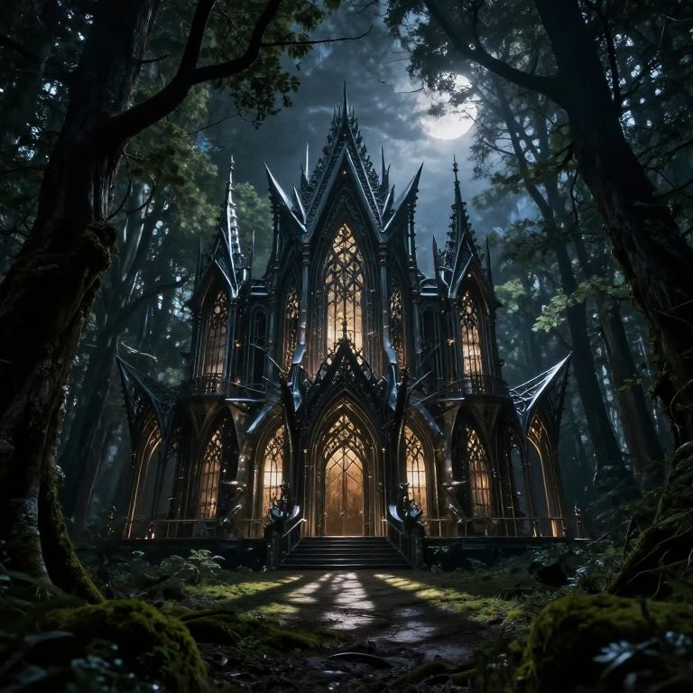 Envision an extraordinary palace crafted from intricate metalwork and sharp angles, reminiscent of H.R. Giger's biomechanical style, nestled within a dark and dense forest. The structure exudes an otherworldly aura as it glows mysteriously from within, casting elongated shadows onto the mossy ground below and illuminating the twisted branches above. As moonlight pierces through the thick foliage, it creates an enchanting yet foreboding atmosphere that beckons the viewer to delve into this enigmatic haven.