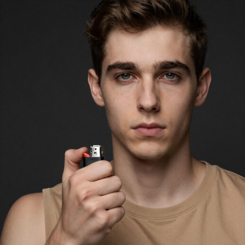 Photograph of a young man with short brown hair, fair skin, and a stubbled face. He holds a small lighter close to his left cheek, illuminating his face. He wears a tan sleeveless shirt. Dark background. Intense, focused expression.