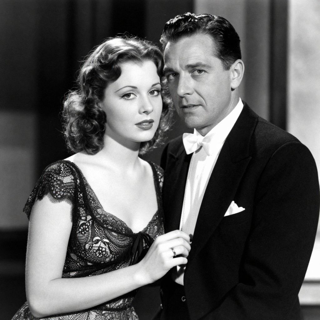A vintage black-and-white illustration depicts a couple dressed in classic 1930s attire, with the woman wearing a lace-trimmed dress reminiscent of the era's fashion, evoking the timeless charm and elegance associated with iconic Hollywood cinema.