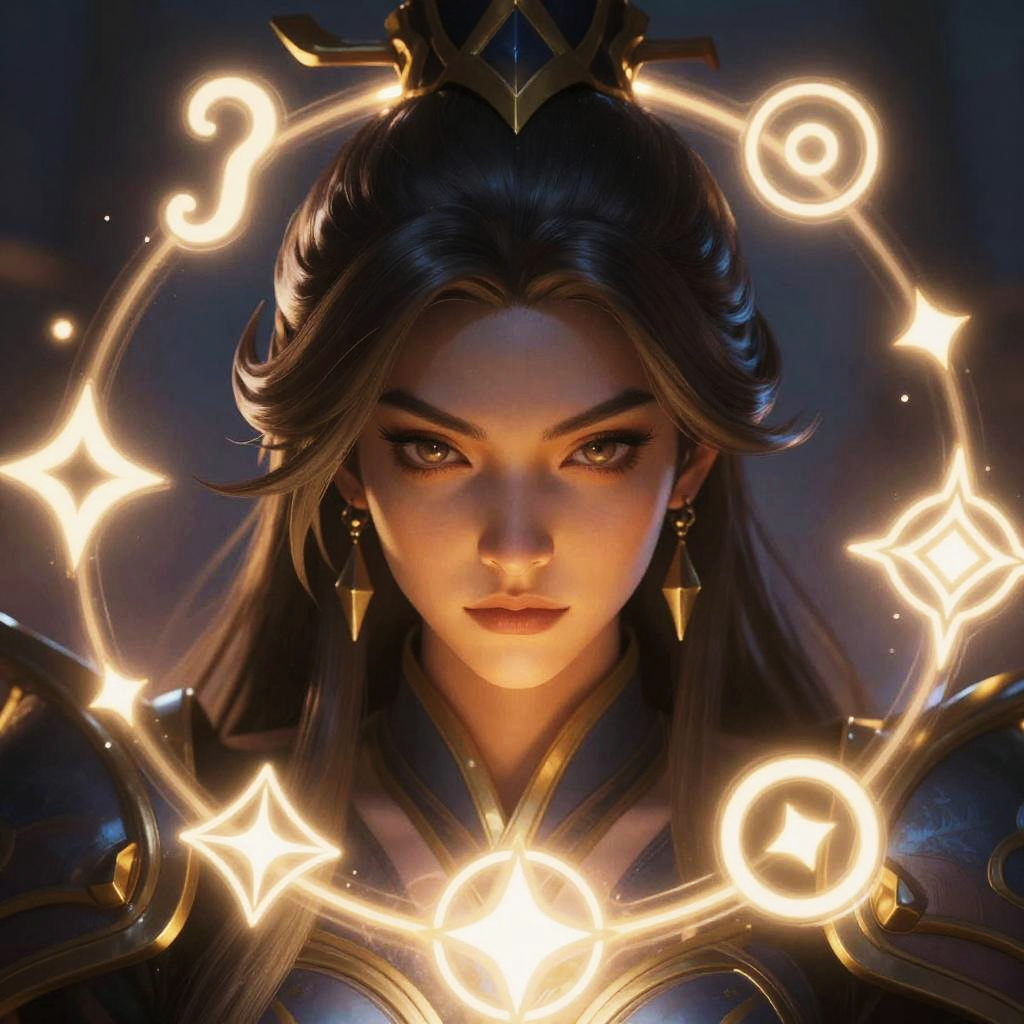 Portrait of face of Dota hero with magical aura, glowing symbols around, smooth but detailed rendering, fantasy epic theme, rich color palette, high resolution