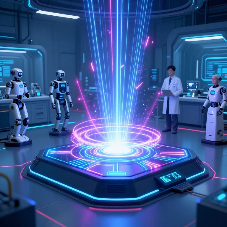Photorealistic CGI image of a futuristic laboratory. Three humanoid robots with white and black metallic bodies stand around a glowing, holographic circular platform emitting bright blue and pink laser beams. A human male in a white lab coat stands to the right, observing. The background features sleek, grey walls with illuminated panels and equipment. The platform has intricate, neon-lit patterns, and the floor is dark and reflective. The scene exudes a sci-fi, high-tech atmosphere.
