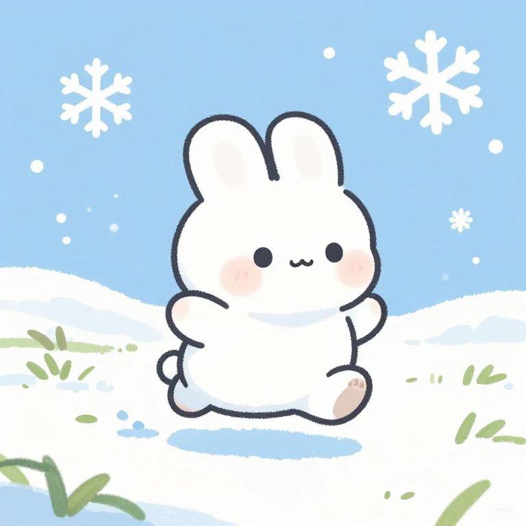 Kawaii snow bunny hopping through a snowy meadow with oversized snowflakes falling around, adorable round cheeks and tiny paws, pastel color palette with soft blues and whites, whimsical and heartwarming scene