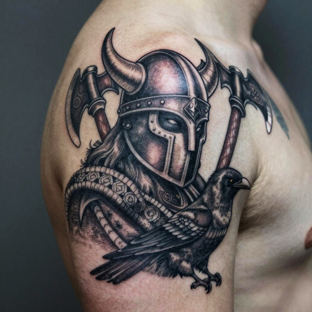 Nordic Viking shoulder tattoo depicting a fierce Viking warrior's helmet intertwined with Norse mythology elements like ravens and axes, detailed line art with dark shadows and highlights, textured skin background, powerful and bold composition.