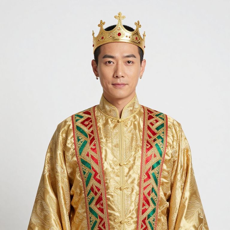 Male wearing a gold robe with a red and green pattern on it. He has a gold crown on his head and earrings on his ears.