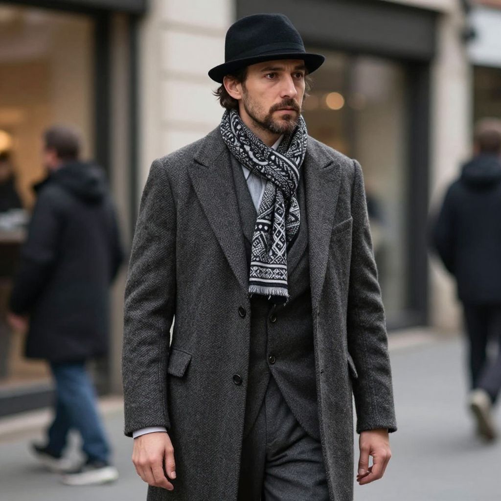 Photograph of a stylish man with dark hair, beard, black hat, and patterned scarf, wearing a gray overcoat, standing on an urban
