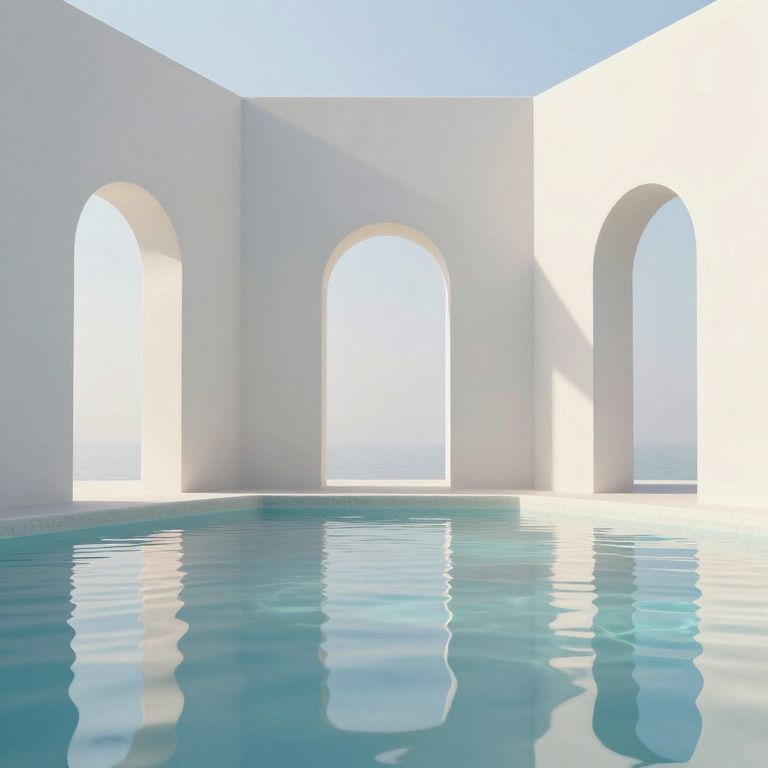 Photograph of a minimalist, sunlit pool area featuring a pristine, white-walled enclosure with three large, evenly spaced arches. The pool water, a clear, turquoise blue, reflects the bright sunlight and the white walls, creating a serene and inviting atmosphere. The smooth, curved arches add a touch of elegance and contrast to the otherwise flat, clean lines of the white walls. The sky above is a clear, vivid blue, enhancing the overall brightness and calmness of the scene. The image is highly symmetrical and emphasizes simplicity, cleanliness, and tranquility.
