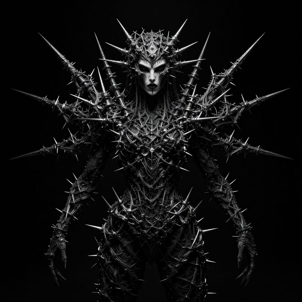 The image presents a striking, high-contrast black and white composition set against a dark, almost entirely black background. The central figure is adorned with intricate, gothic-inspired designs that resemble twisted, barbed wire or sharp, jagged elements. These elements are densely packed and cover the entire figure, creating a sense of depth and complexity. The figure's face is elongated and angular, with sharp features that add to the overall menacing and otherworldly appearance. The textures are highly detailed, with a mix of smooth and rough surfaces that contribute to the overall dark, alternative aesthetic. The composition is symmetrical, with the figure positioned centrally, and the designs radiating outward, creating a balanced yet intense visual impact. The overall effect is one of dark, gothic elegance, with the figure appearing both powerful and mysterious.