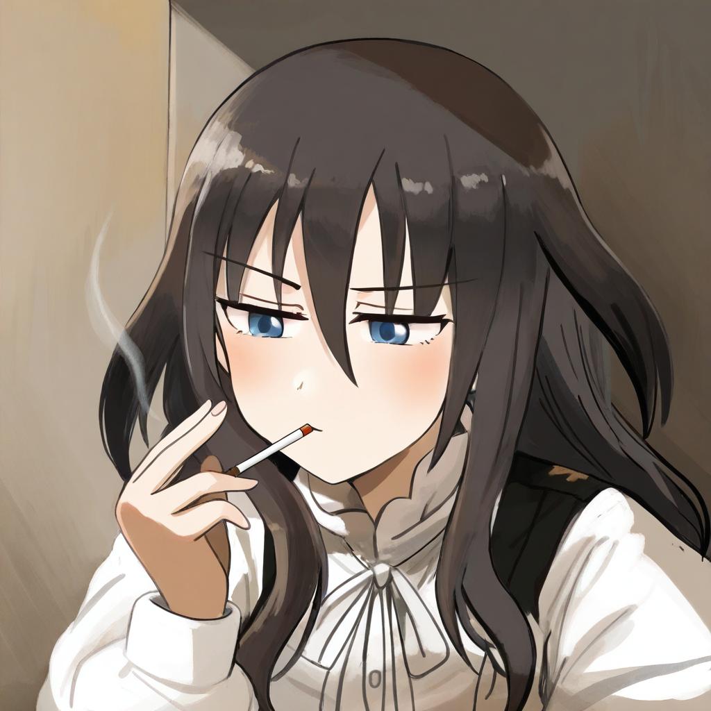 Elizabeth f. beurling, world witches series, 1girl, blue eyes, long hair, brown hair, black hair, cigarette, by artist diva (hyxpk), animagine