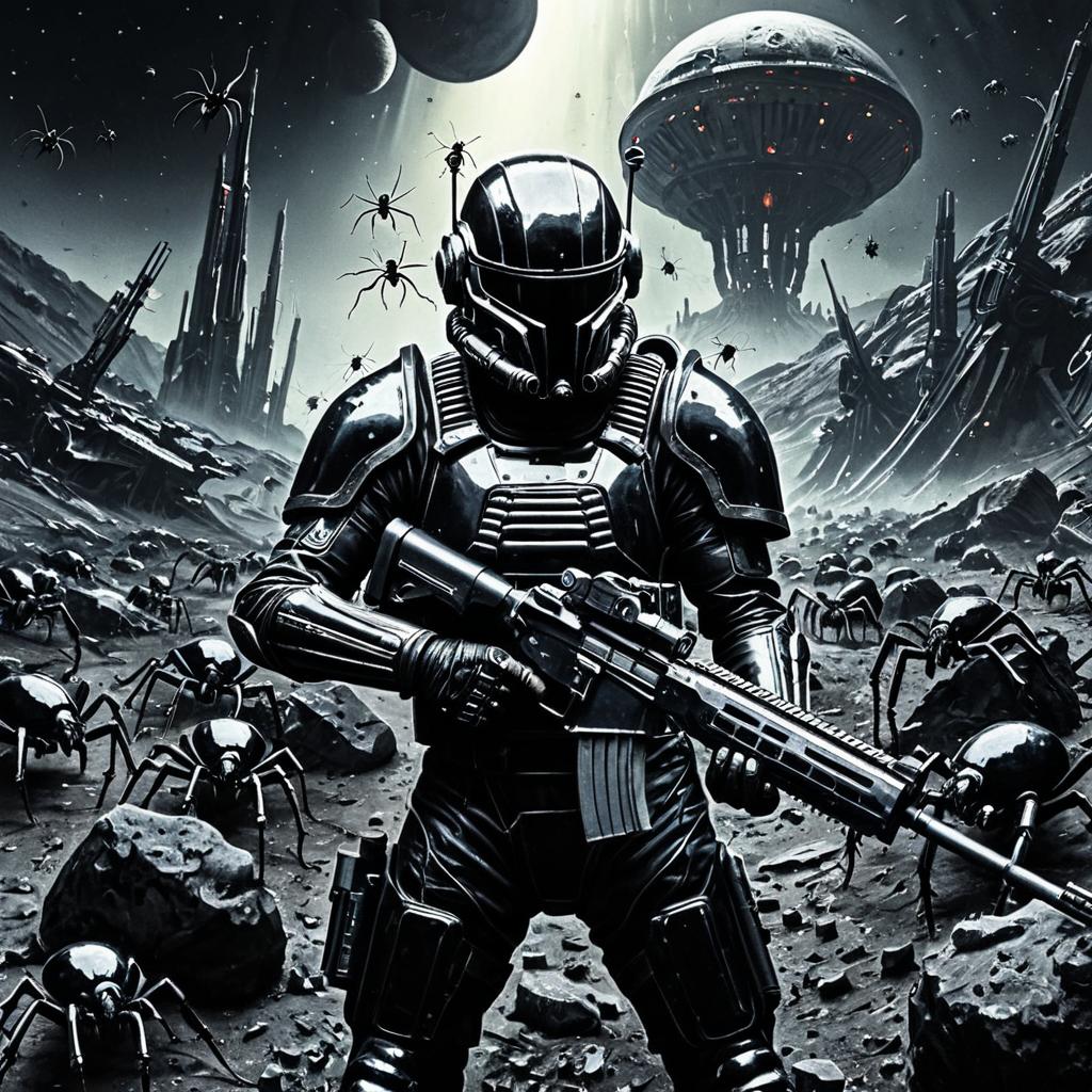 Valley HR Giger style highly detailed oil painting with dramatic lighting. A View of a battlefield in the 24th century. A war zone in the future on a rocky planet. We see thousands of ants and spiders which are colored black and fighting against a lonely man. He is wearing a space battle suite. He is desperate. The battle suite is made out of metal or plastic and is very shiny. He is wearing a helmet which covers his face. He is holding a rifle or a gun.,