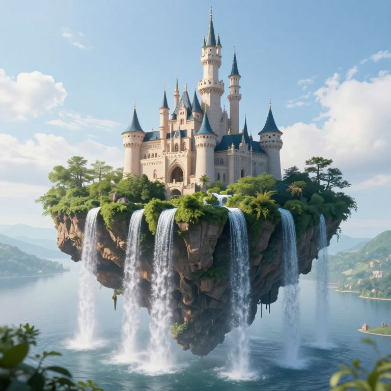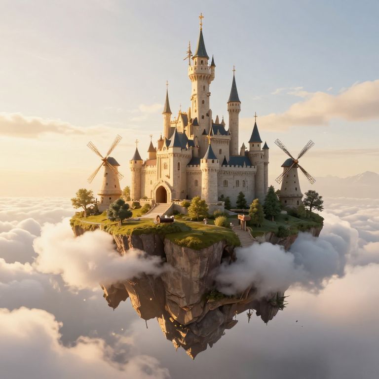 A majestic castle floats serenely among the clouds, tethered by golden threads to whimsical, loaf-shaped balloons that drip trails of bread crumbs into the ethereal mist below.
