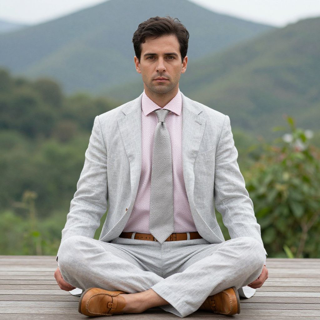 A man, light gray linen suit, pale pink point collar shirt, textured silk tie in soft gray, tan leather loafers, matching tan leather belt, open-air yoga deck, lush greenery, tranquil mountain backdrop, oversaturated film, serene expression. Man has masculine face and piercing eyes
