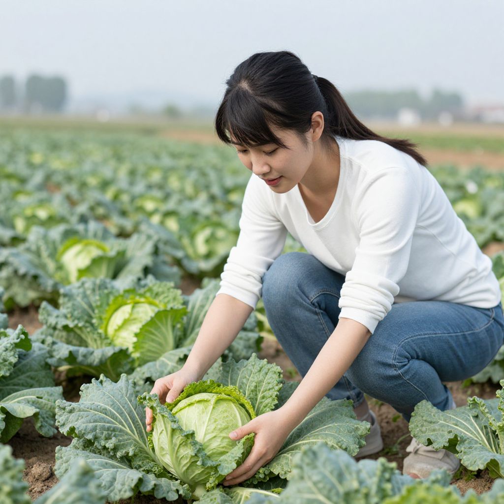 Photograph of an Asian woman with black hair in a ponytail, wearing a light blue shirt and gloves, crouching in a cabbage field,