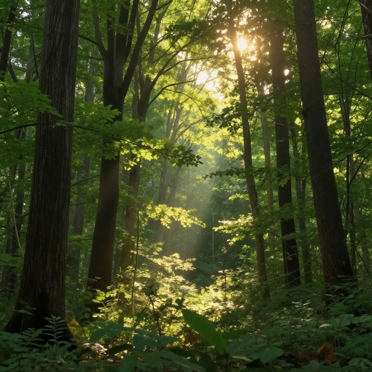 A serene forest bathed in the ethereal glow of golden-hour sunlight filtering through lush green foliage, evoking a harmonious natural symphony where light and shadow dance in perfect balance, captured in a high-definition digital rendering that highlights the tranquil beauty of the woodland ecosystem.