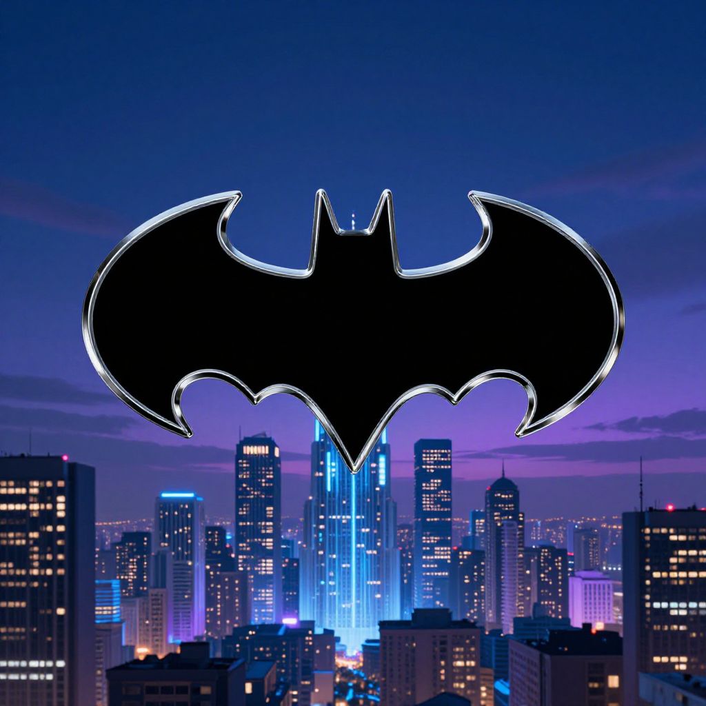 High contrast Batman logo vector with a metallic chrome effect, floating above a futuristic city skyline at twilight, illuminated by glowing blue and purple light reflections, emphasizing a cyberpunk aesthetic.